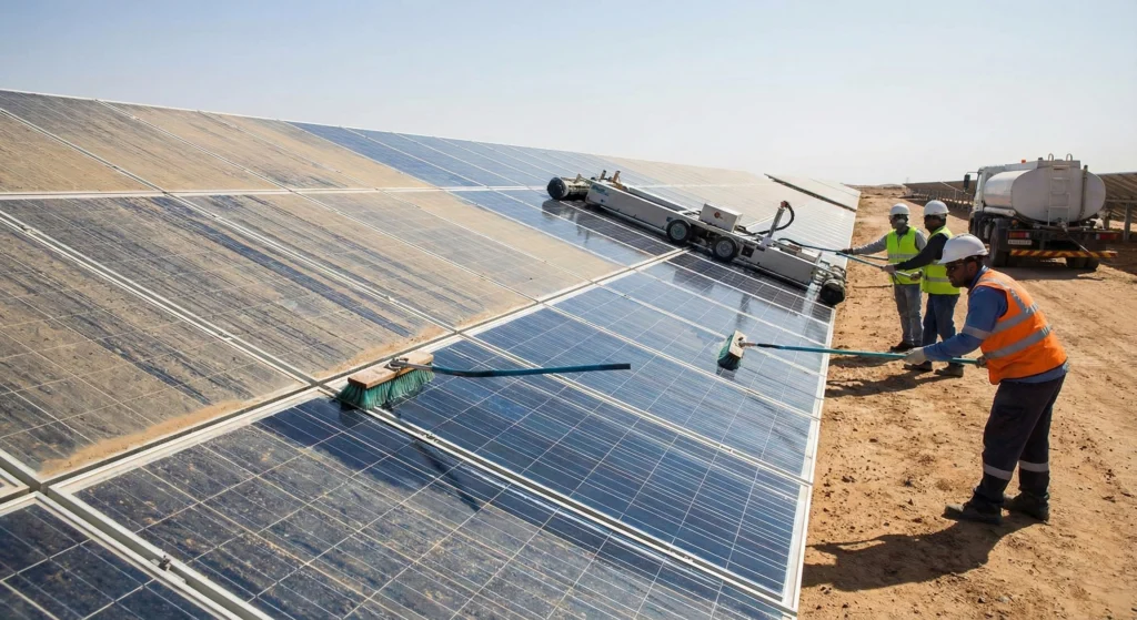 أكبر عدو للطاقة الشمسية في الكويت هو الغبار. النظام المتسخ يفقد 40% من قدرته. بينما تتركك الشركات الأخرى لتعاني مع التنظيف اليدوي، تقدم “سطوع” حلولاً متكاملة تشمل روبوتات التنظيف الآلي أو الألواح ذات الطلاء النانوي الطارد للغبار، مما يضمن لك أقصى إنتاجية طوال العام.